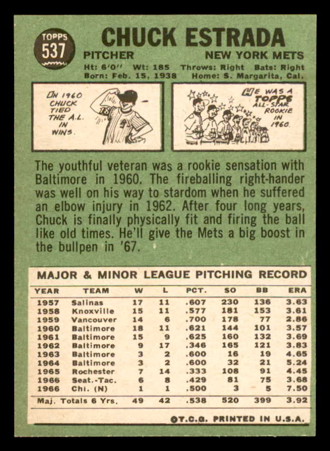 1967 Topps Baseball #537 Chuck Estrada Mets NR-MT 542952
