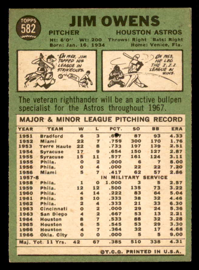 1967 Topps Baseball #582 Jim Owens Astros NR-MT 542987