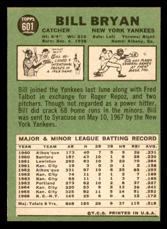 1967 Topps Baseball #601 Bill Bryan Yankees VG-EX/EX 543076