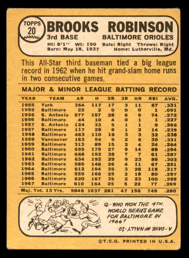1968 Topps Baseball #020 Brooks Robinson Orioles VG-EX 546128