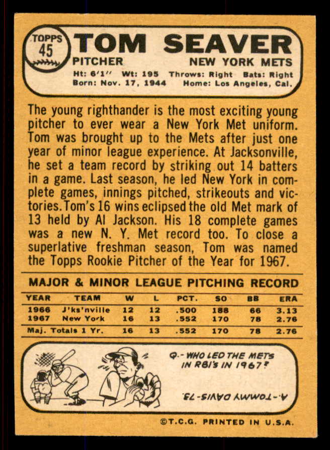 1968 Topps Baseball #045 Tom Seaver Mets NR-MT 545353