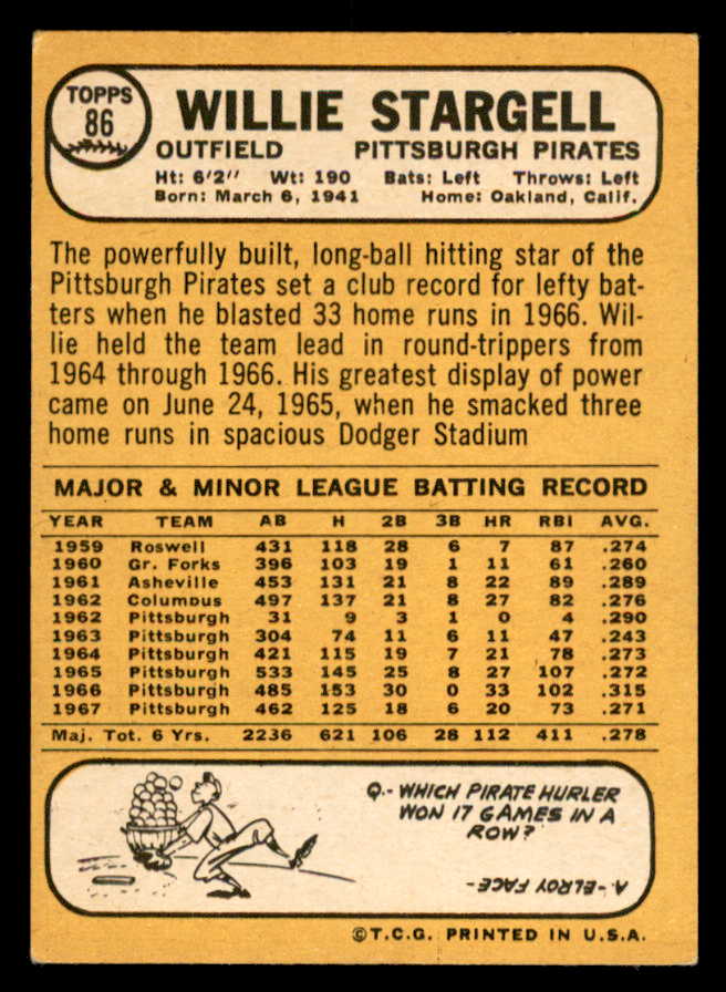 1968 Topps Baseball #086 Willie Stargell Pirates EX-MT 541009