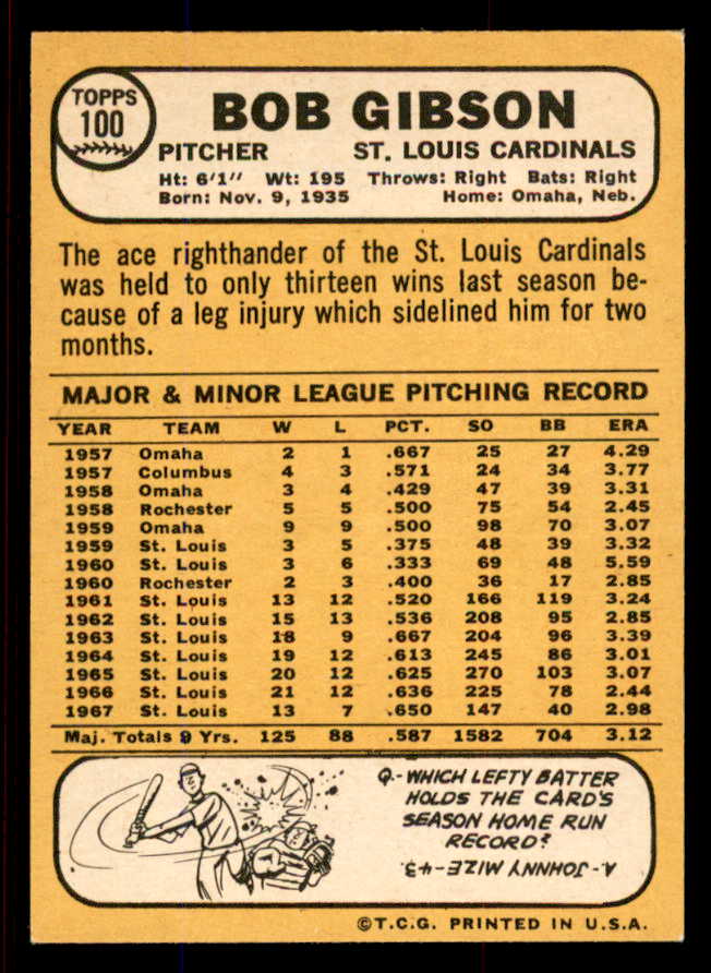 1968 Topps Baseball #100 Bob Gibson Cardinals NR-MT 545352