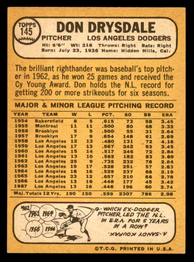 1968 Topps Baseball #145 Don Drysdale Dodgers NR-MT 539476