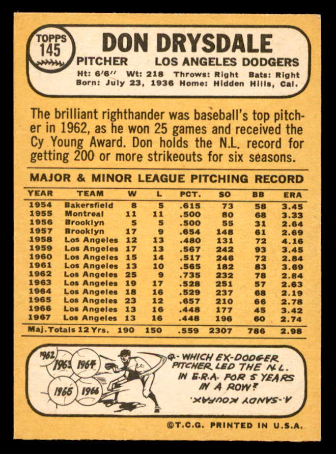 1968 Topps Baseball #145 Don Drysdale Dodgers NR-MT 546120