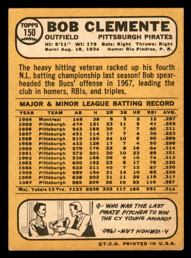 1968 Topps Baseball #150 Roberto Clemente Pirates VG 541056