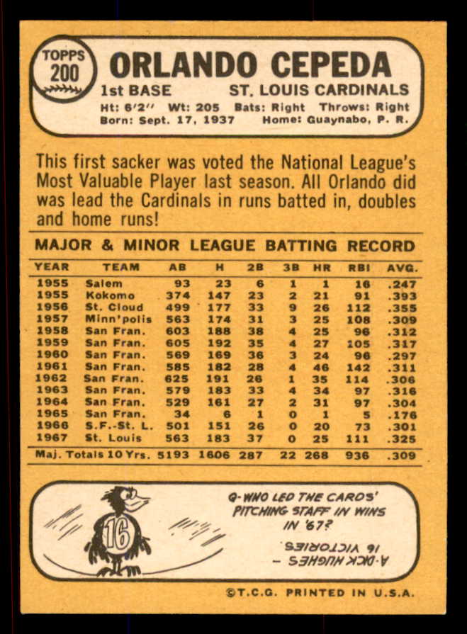 1968 Topps Baseball #200 Orlando Cepeda Cardinals NR-MT 545366