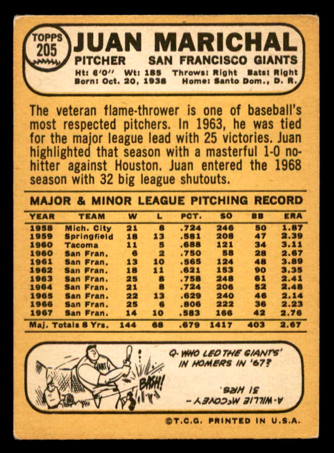 1968 Topps Baseball #205 Juan Marichal Giants EX 546098