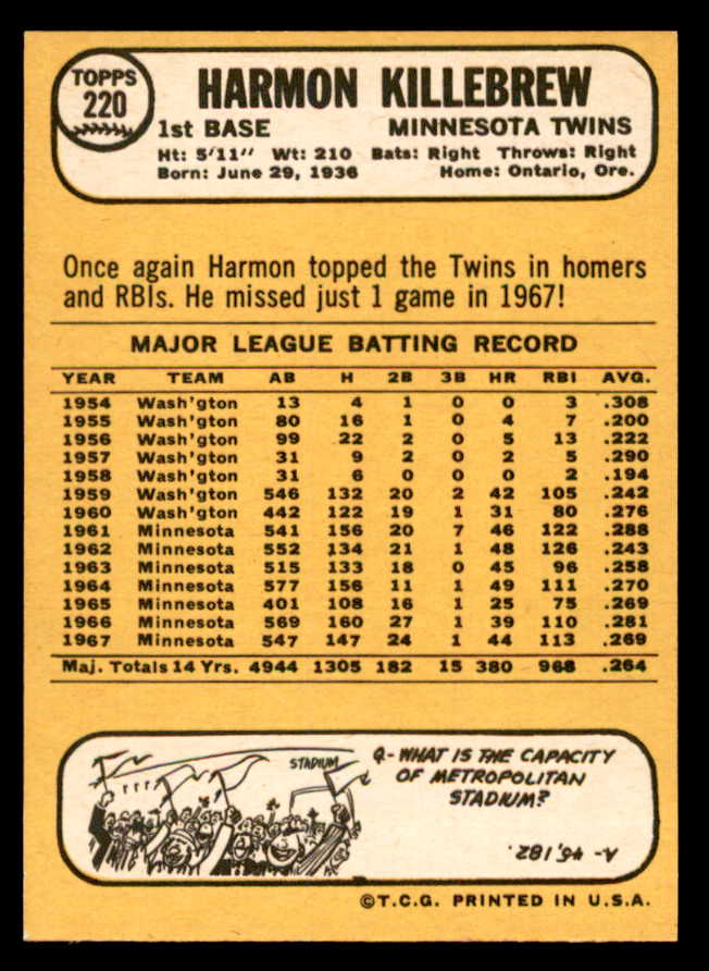 1968 Topps Baseball #220 Harmon Killebrew Twins NR-MT 539470