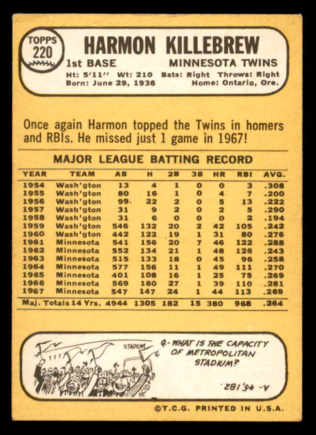 1968 Topps Baseball #220 Harmon Killebrew Twins VG-EX 546107