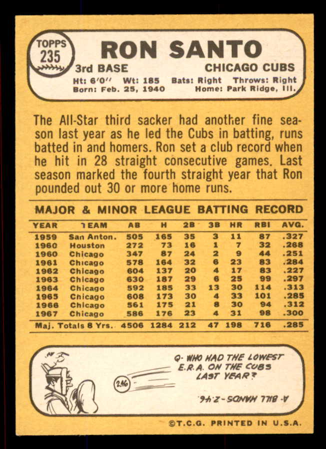 1968 Topps Baseball #235 Ron Santo Cubs NR-MT 545365