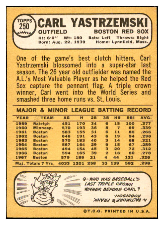 1968 Topps Baseball #250 Carl Yastrzemski Red Sox EX-MT 536404