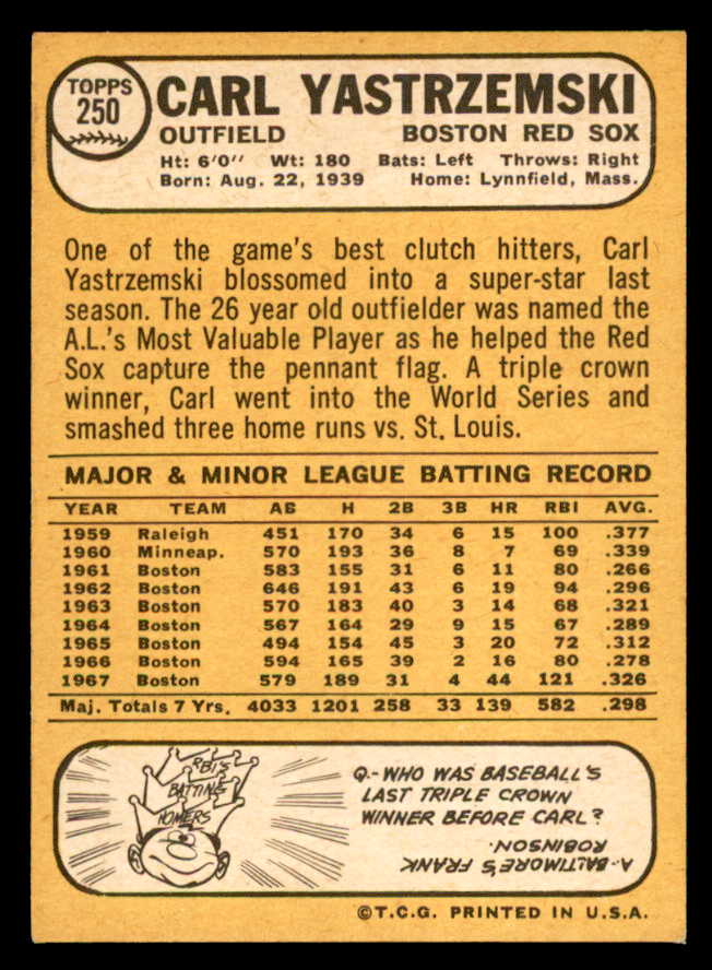 1968 Topps Baseball #250 Carl Yastrzemski Red Sox NR-MT 539237