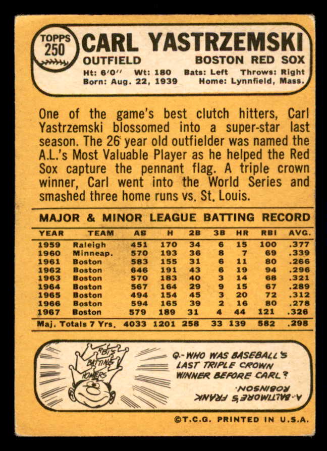 1968 Topps Baseball #250 Carl Yastrzemski Red Sox VG 541010