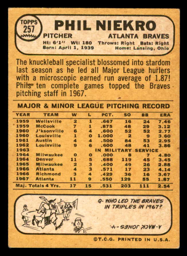 1968 Topps Baseball #257 Phil Niekro Braves EX 541041