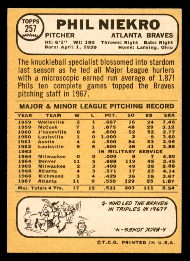 1968 Topps Baseball #257 Phil Niekro Braves NR-MT 539013