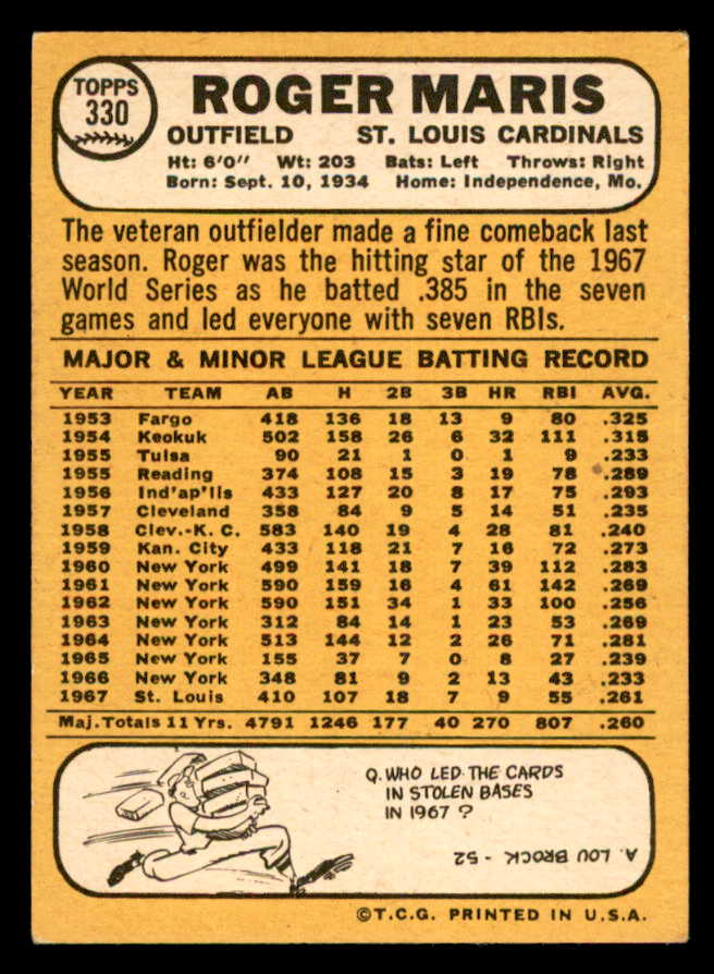 1968 Topps Baseball #330 Roger Maris Cardinals EX+/EX-MT 539248