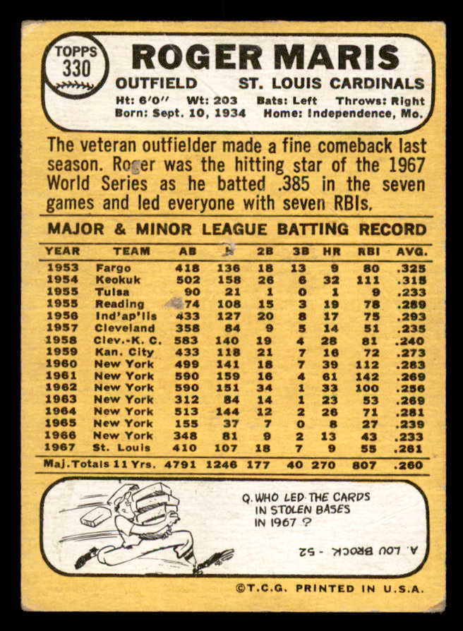 1968 Topps Baseball #330 Roger Maris Cardinals GD-VG 541035