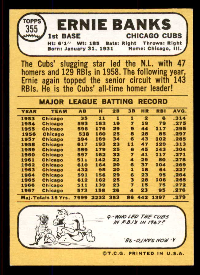 1968 Topps Baseball #355 Ernie Banks Cubs EX 545433