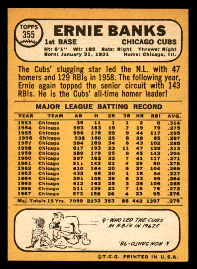 1968 Topps Baseball #355 Ernie Banks Cubs NR-MT 538922