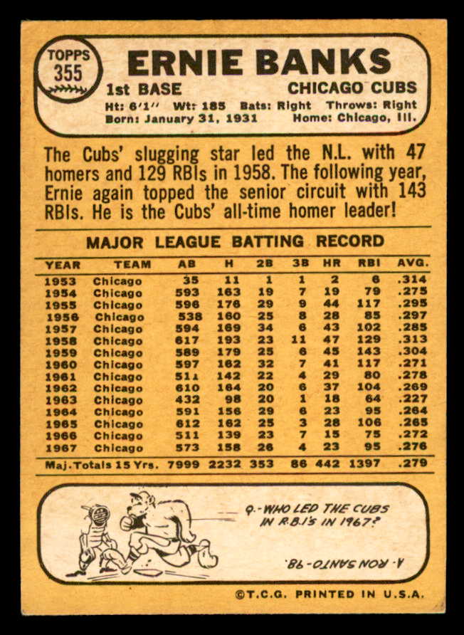 1968 Topps Baseball #355 Ernie Banks Cubs NR-MT 539243