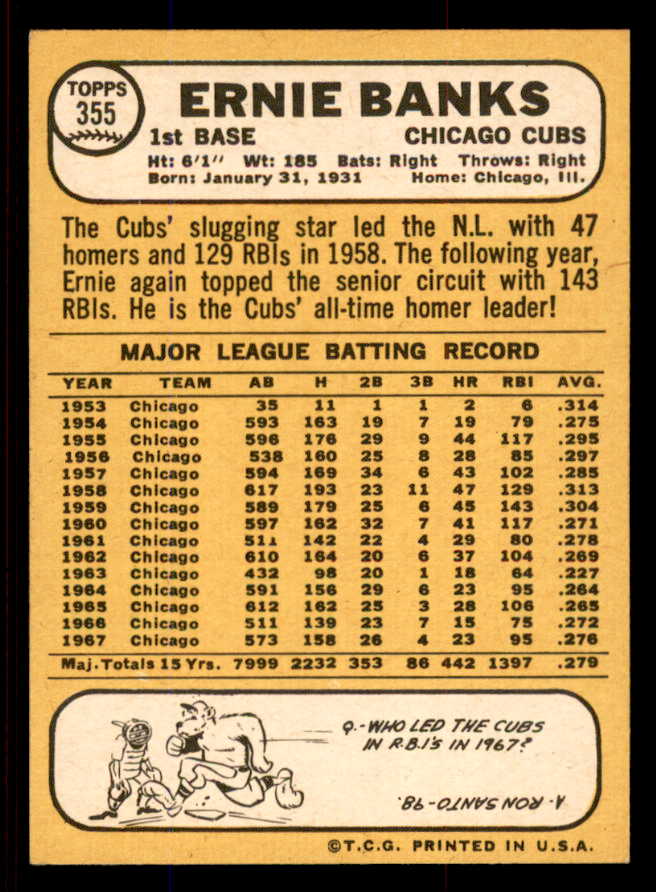 1968 Topps Baseball #355 Ernie Banks Cubs NR-MT 545364