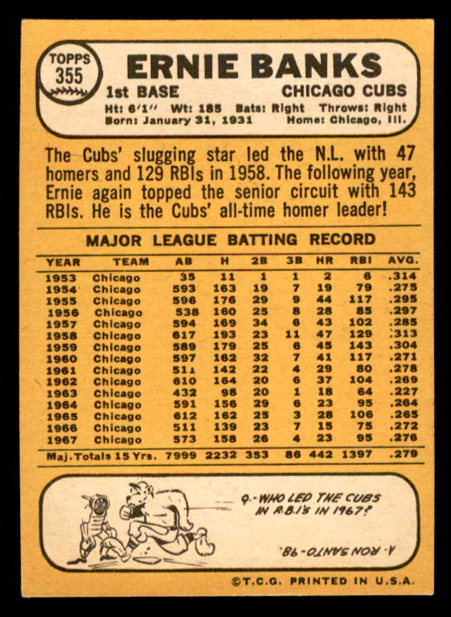1968 Topps Baseball #355 Ernie Banks Cubs VG-EX 539263
