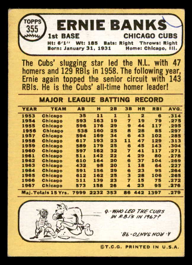 1968 Topps Baseball #355 Ernie Banks Cubs VG-EX 539861