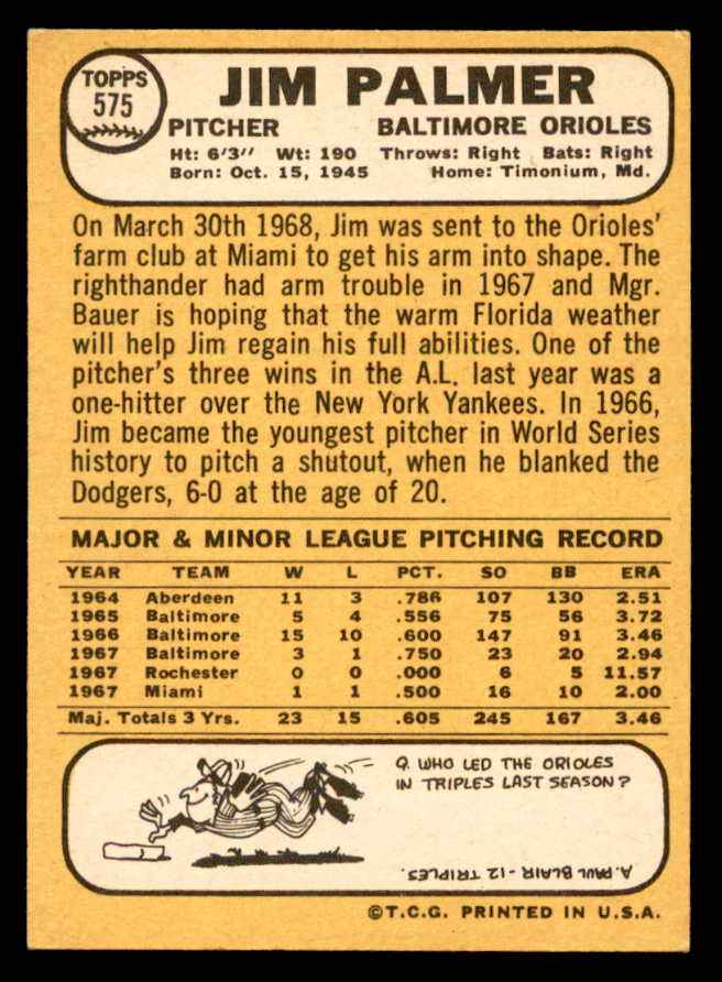 1968 Topps Baseball #575 Jim Palmer Orioles EX-MT 546095