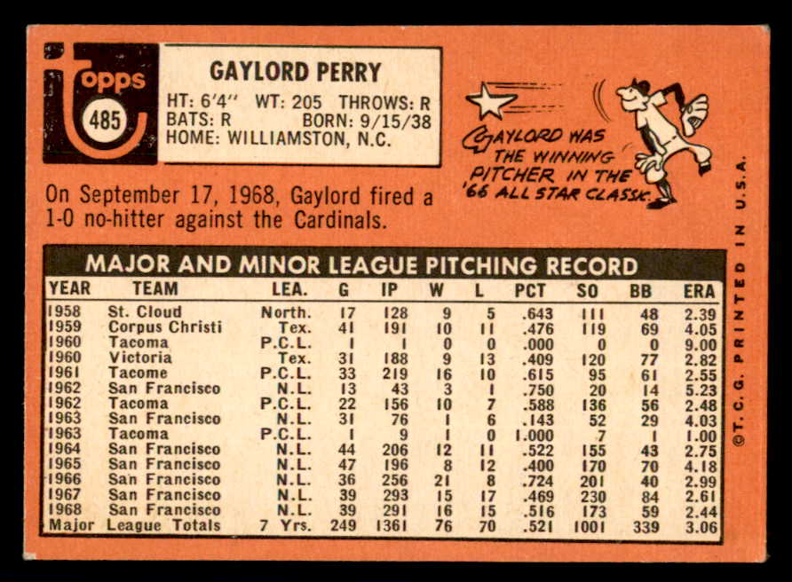 1969 Topps Baseball #485 Gaylord Perry Giants EX 541110
