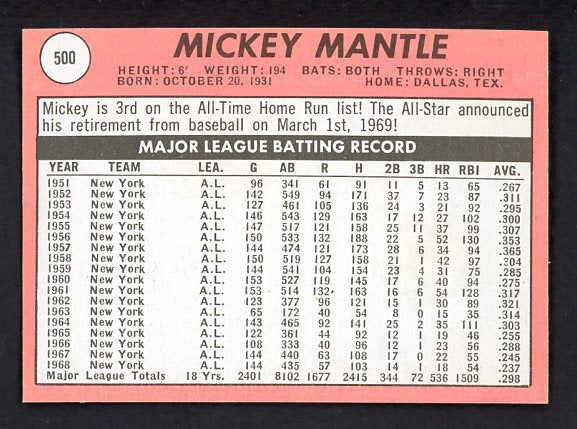1969 Topps Baseball #500 Mickey Mantle Yankees NR-MT 538529