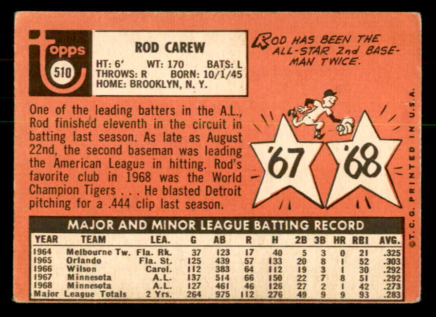 1969 Topps Baseball #510 Rod Carew Twins VG 541374