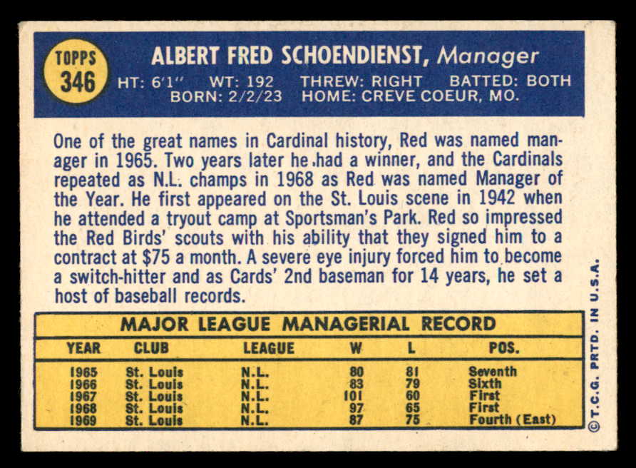 1970 Topps Baseball #346 Red Schoendienst Cardinals EX 546016