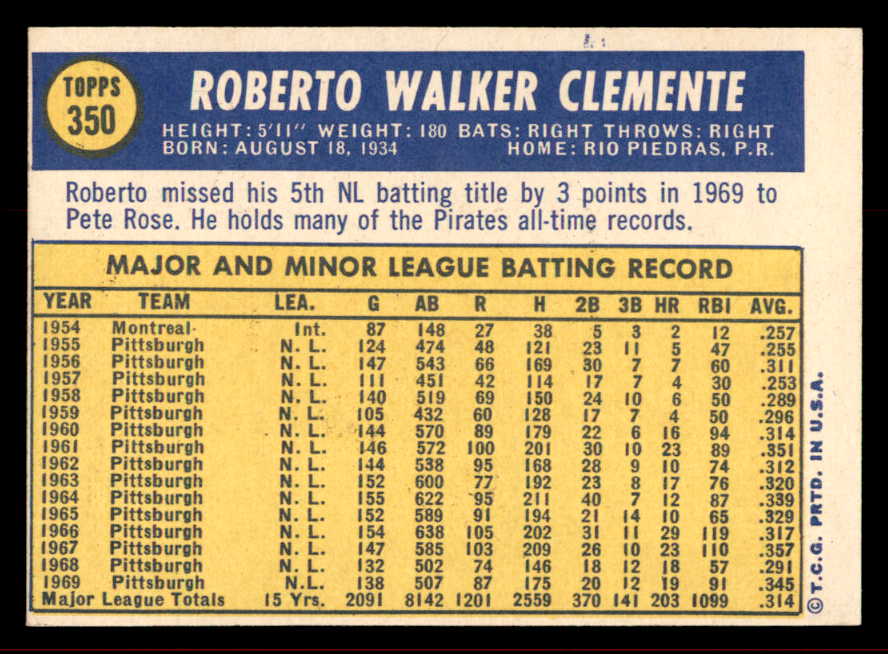 1970 Topps Baseball #350 Roberto Clemente Pirates EX+/EX-MT 545606