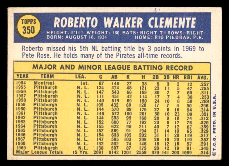 1970 Topps Baseball #350 Roberto Clemente Pirates VG-EX 546004