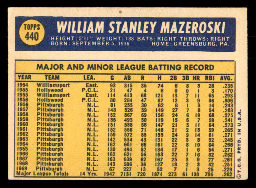 1970 Topps Baseball #440 Bill Mazeroski Pirates EX+/EX-MT 541429