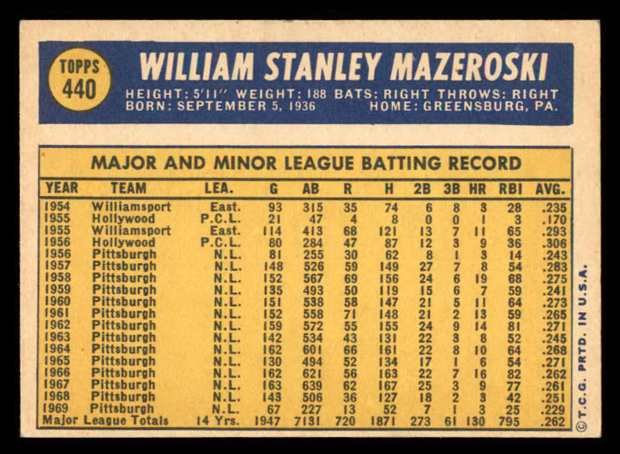 1970 Topps Baseball #440 Bill Mazeroski Pirates EX+/EX-MT 545995