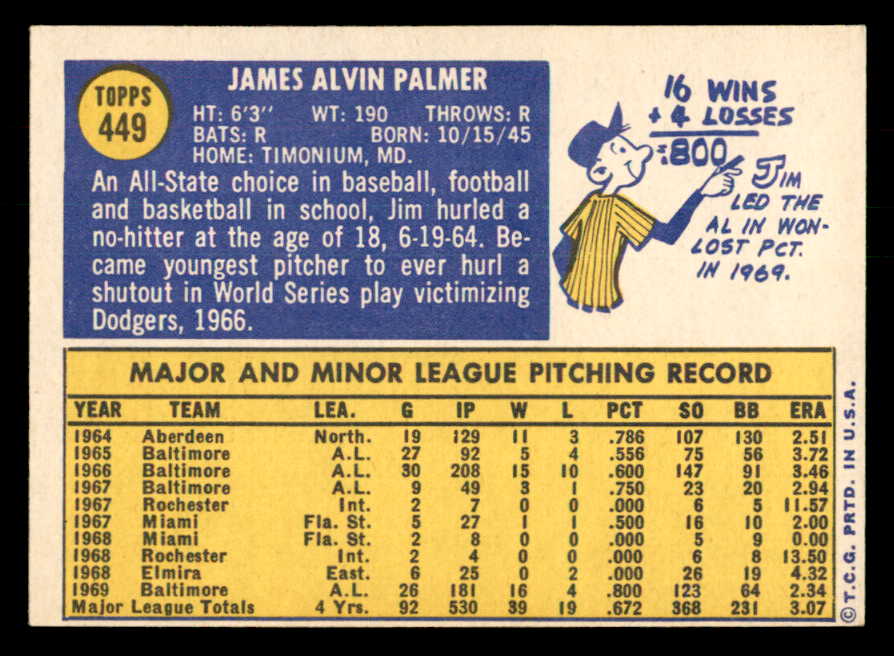 1970 Topps Baseball #449 Jim Palmer Orioles EX+/EX-MT 541449