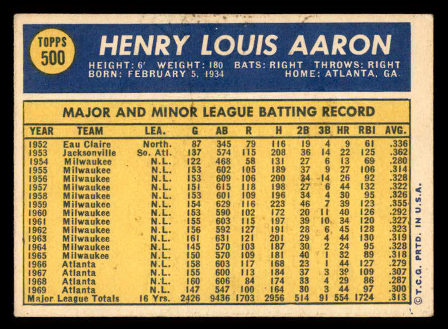 1970 Topps Baseball #500 Hank Aaron Braves VG-EX 546001
