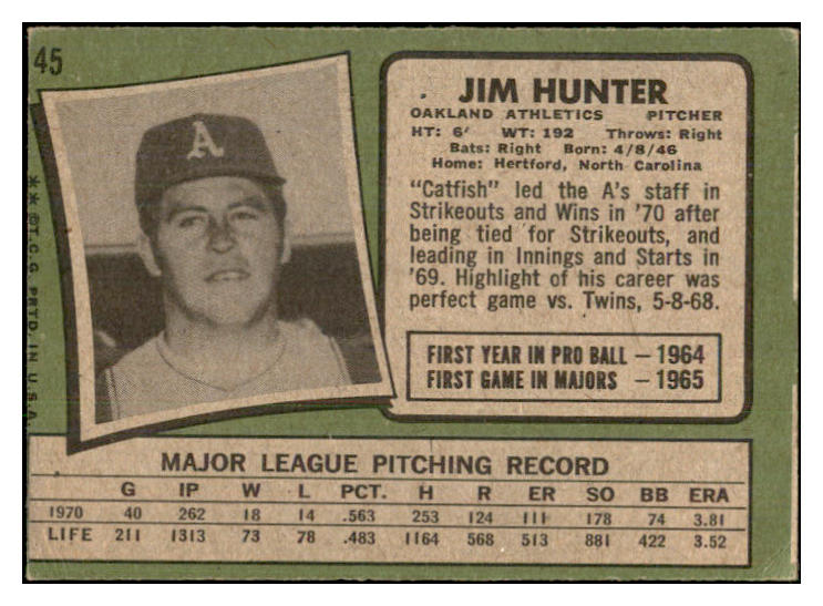 1971 Topps Baseball #045 Catfish Hunter A's VG-EX 534233