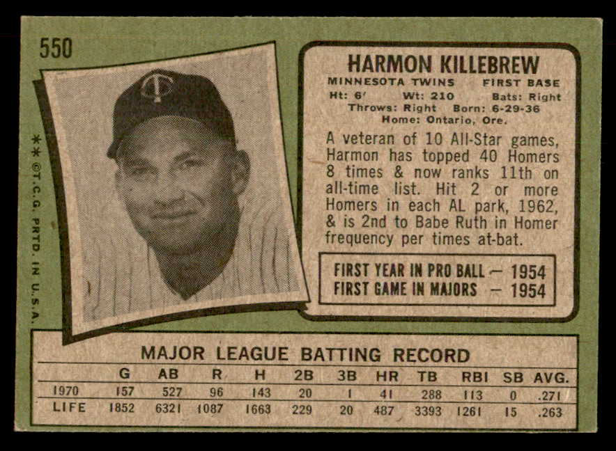 1971 Topps Baseball #550 Harmon Killebrew Twins EX 541675