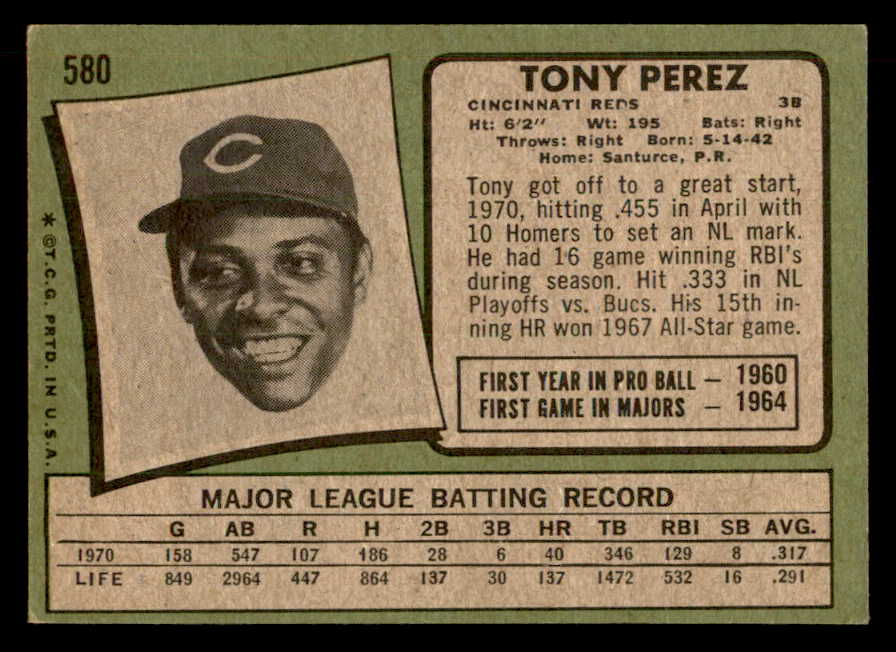 1971 Topps Baseball #580 Tony Perez Reds EX 541705