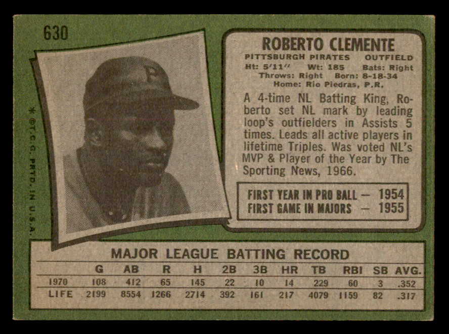 1971 Topps Baseball #630 Roberto Clemente Pirates VG-EX 538980
