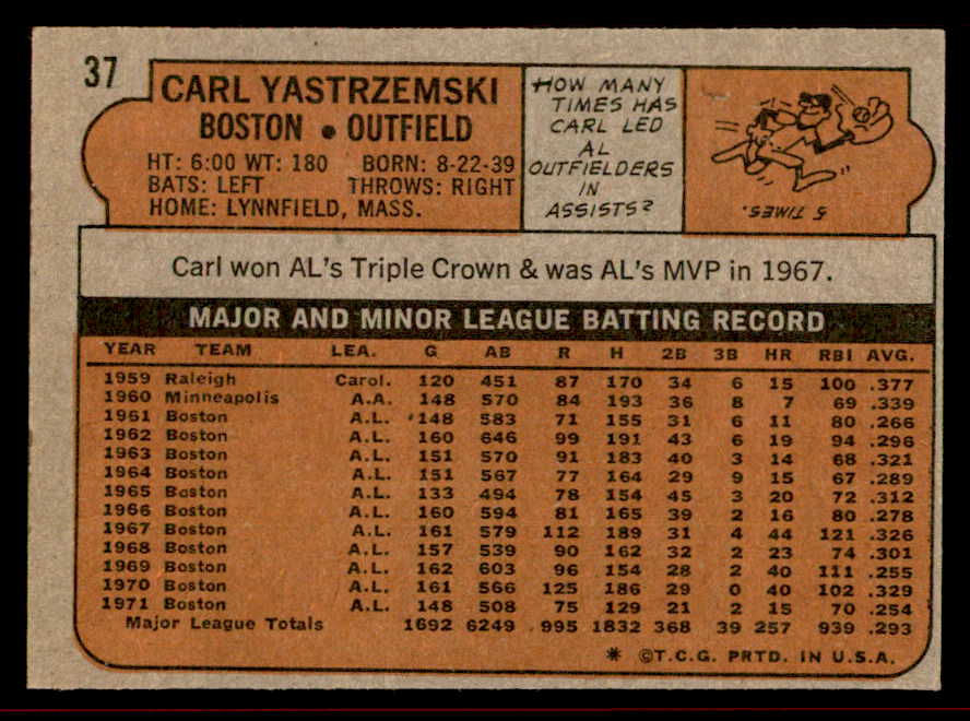 1972 Topps Baseball #037 Carl Yastrzemski Red Sox EX 542186