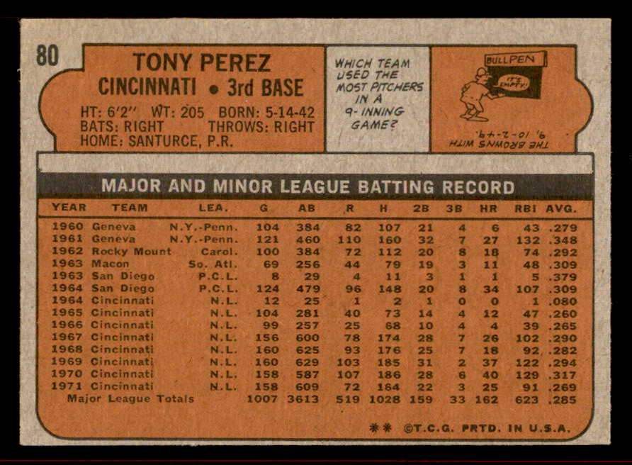 1972 Topps Baseball #080 Tony Perez Reds EX-MT 542156