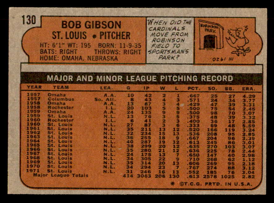 1972 Topps Baseball #130 Bob Gibson Cardinals NR-MT 541521