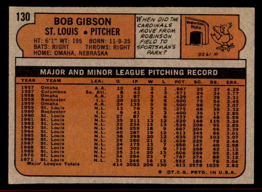 1972 Topps Baseball #130 Bob Gibson Cardinals VG-EX 542176