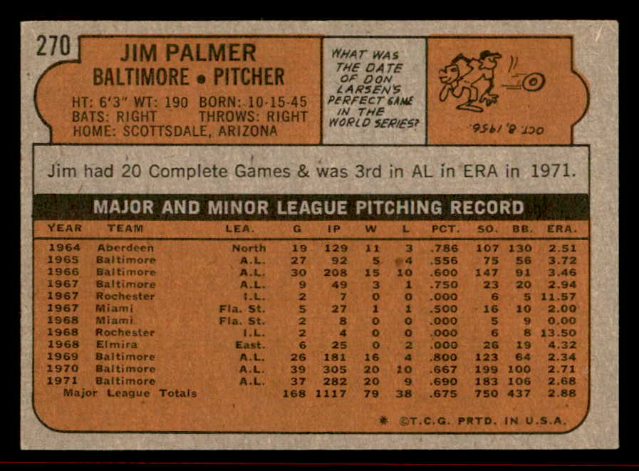 1972 Topps Baseball #270 Jim Palmer Orioles EX-MT 542145
