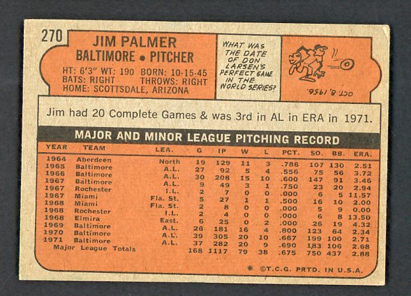 1972 Topps Baseball #270 Jim Palmer Orioles VG-EX 542144