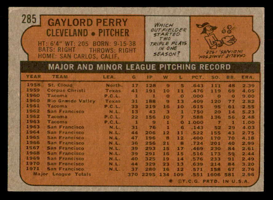 1972 Topps Baseball #285 Gaylord Perry Indians EX-MT 541517